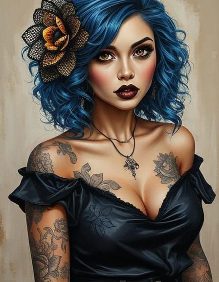 This image shows a beautiful woman with blue curly hair and floral tattoos. She has striking light brown eyes, wears an off-the-shoulder leather blouse, and exudes a flirtatious charm in an oil painting.