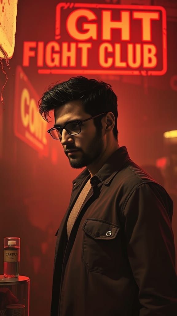 This image depicts a movie poster for Fight Club featuring Tyler Durden. The artwork employs contrasting colors with sepia and electric crimson tones in a wide-angle, underground DSLR style.