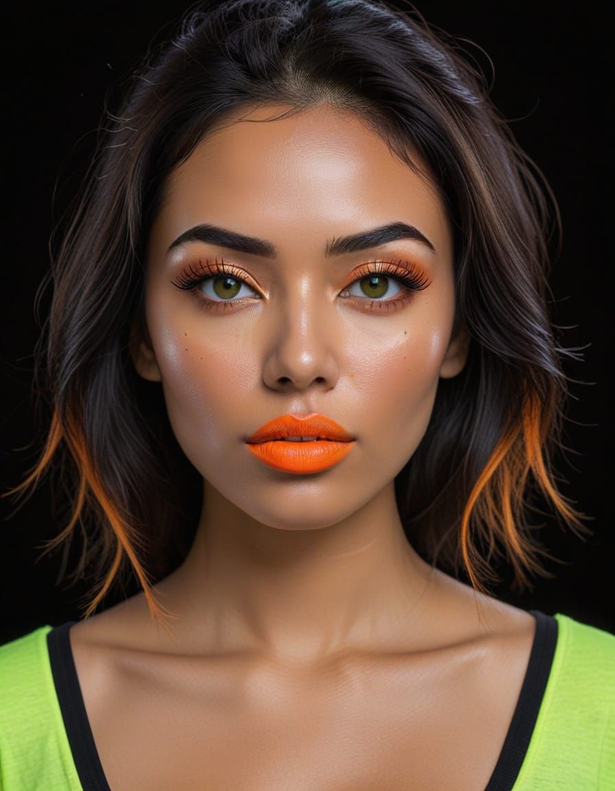 This image shows a close-up portrait of a young Indonesian woman with striking neon orange eyeliner and lipstick against a jet black backdrop with bokeh. The image is highly detailed.