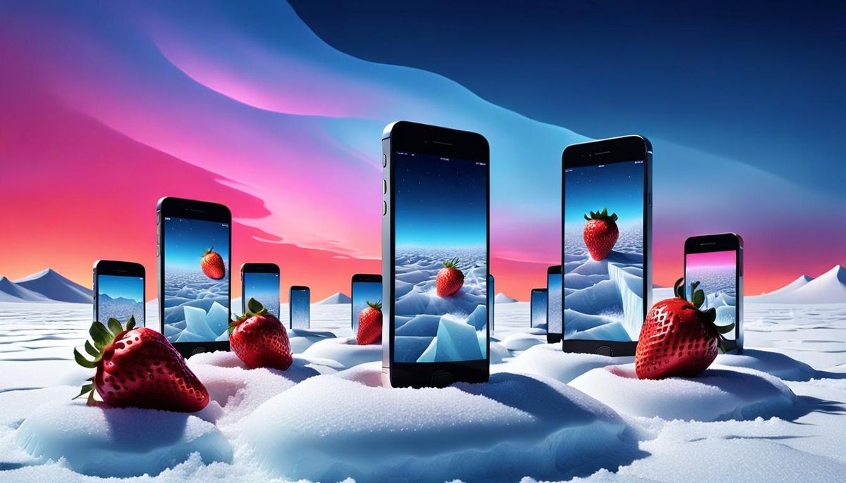A surreal digital artwork showing iPhones half-buried in snow, their screens displaying deserts and strawberries. A demon crashes cymbals amidst swirling fractal skies in a psychedelic scene with high contrast.