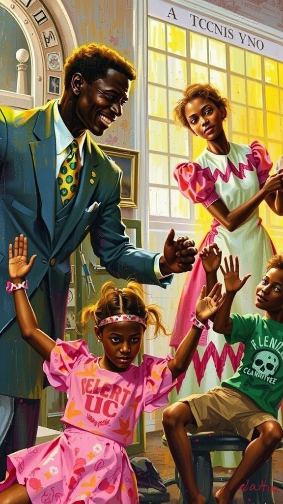 This image shows a photorealistic depiction of a nuclear family with cinematic lighting. The digital illustration is highly detailed, resembling a matte painting with concept art elements.
