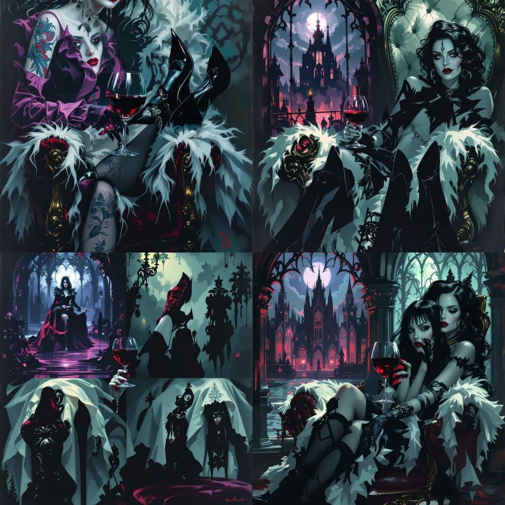 This image shows a beautiful goth woman with red lipstick and piercings, relaxing with a glass of wine. Rendered in a dramatic, illustrative style reminiscent of Gustave Doré.