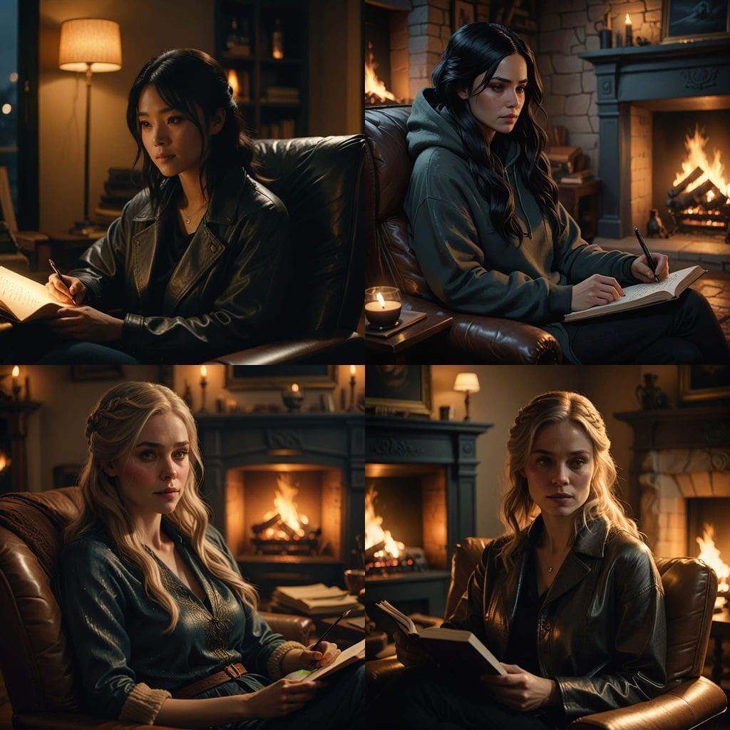 This image shows a digital goddess with dark hair relaxing in an armchair by a fireplace. Rendered in a cinematic, semi-realistic style with soft lighting.