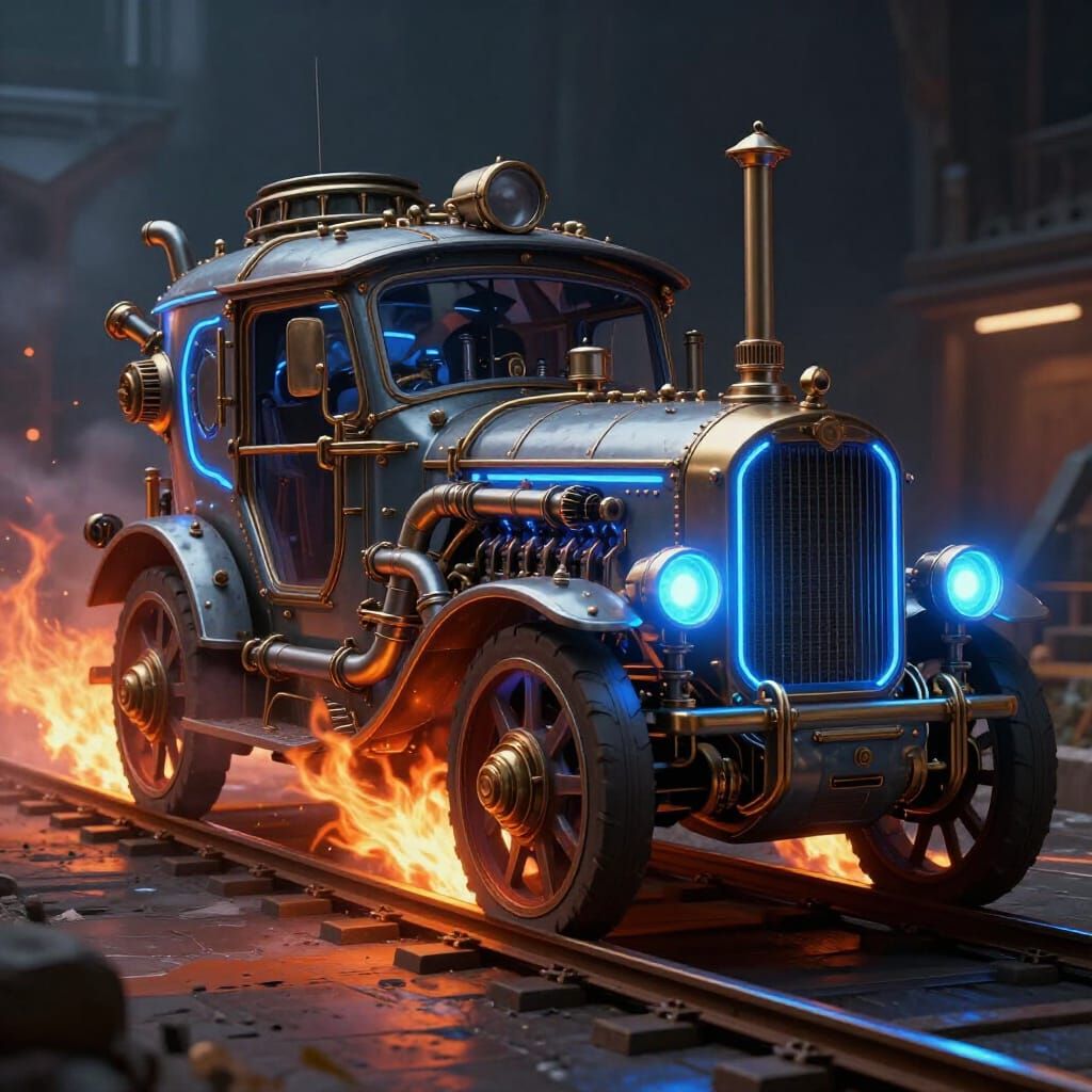A highly detailed 3D anime concept art of a steampunk vehicle adapted for railway tracks. Features glowing blue lights, intricate pipes, and vibrant flames, rendered with advanced 8K techniques.