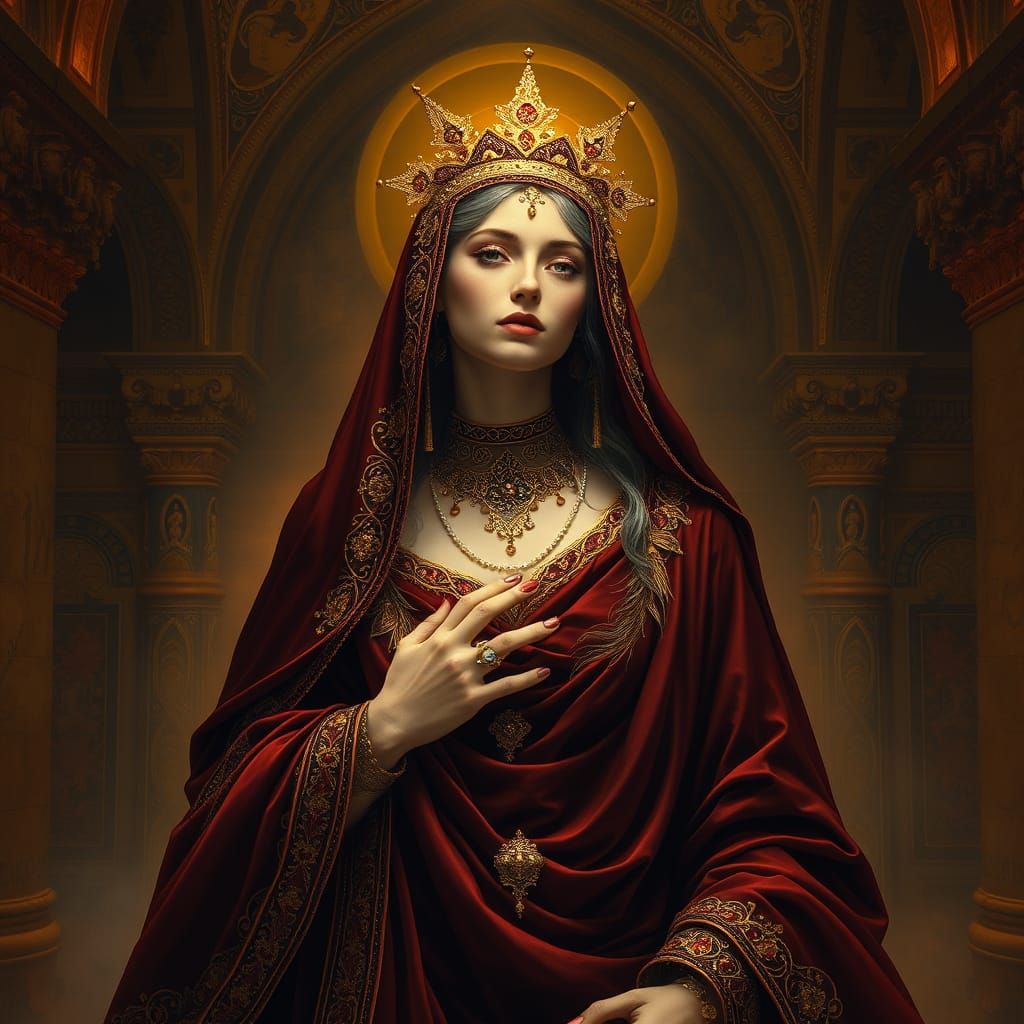 This image depicts a mystical Byzantine maiden in rich, velvety attire, surrounded by grand arches and gemstone mosaics, evoking the opulence of a bygone era in a dynamic, high-contrast style