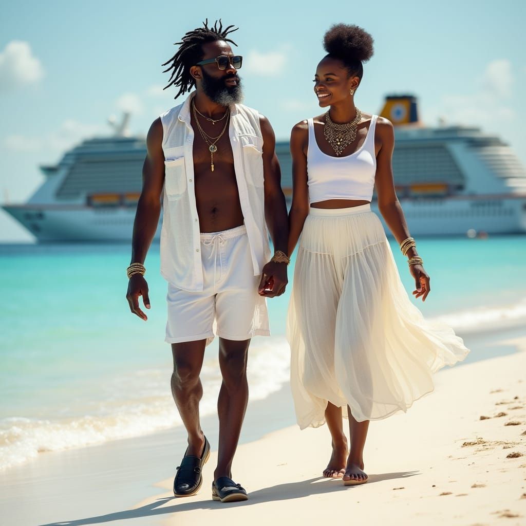 A vibrant image of an African American man and a Nigerian woman walking on a tropical beach with a cruise ship in the background. The image features shallow depth of field and bokeh, creating a detailed, realistic portrait reminiscent of 1960s portraiture.