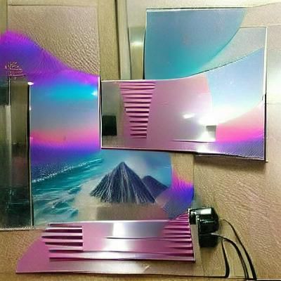 This image shows a scene of infinite vaporwave mirrors, reflecting a retro aesthetic with neon colors and geometric shapes, creating a surreal and immersive visual experience.