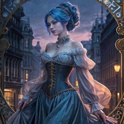 This image depicts a striking woman with vibrant blue hair and an elaborate updo, wearing a vintage corset and flowing gown. The scene features dramatic lighting and a rich twilight color palette.