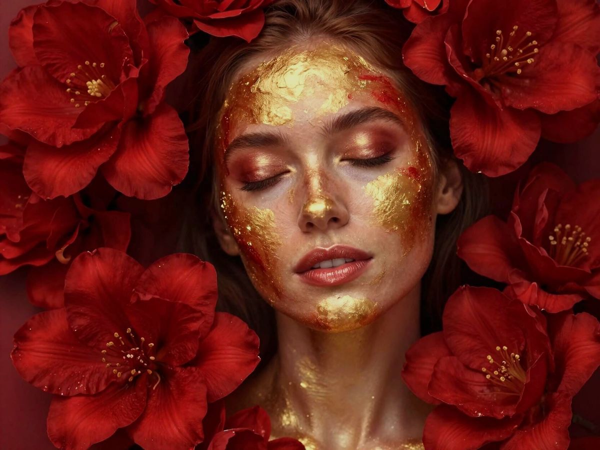 A hyper-realistic image of a woman with eyes closed, surrounded by red flowers. Her skin features gold leaf patterns, with a color palette of red and gold.