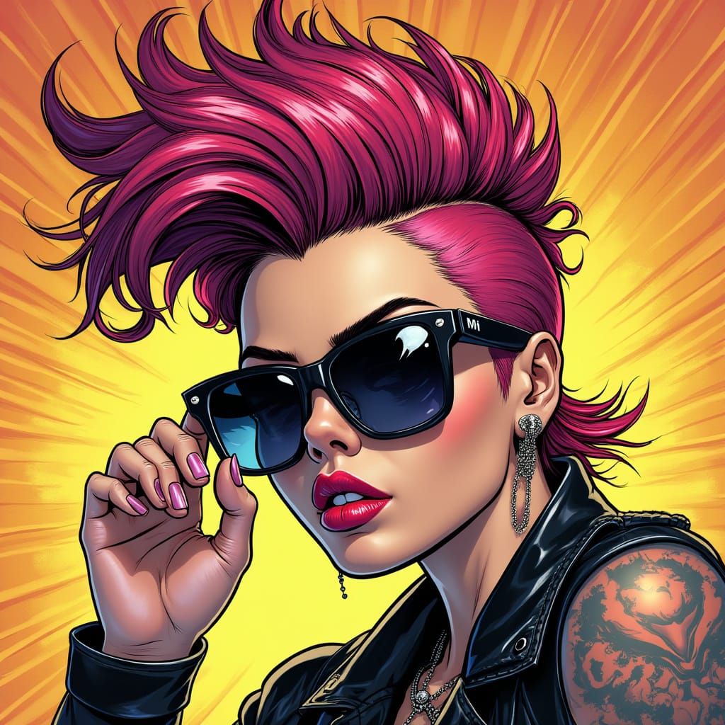 A striking picture of a woman with a mohawk delivering an uppercut. She sports vibrant, colorful hair and reflective sunglasses, set against a dynamic comic book backdrop with hyper-realistic details.