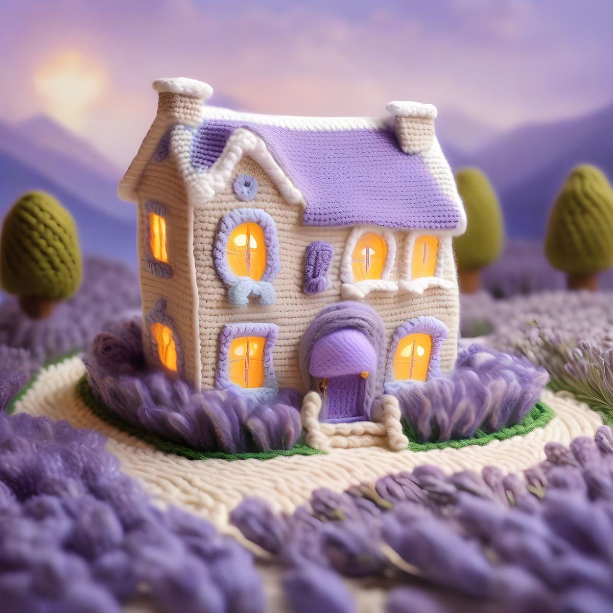 A whimsical image of a Provence-style house and lavender bushes all crafted from knitted yarn. The scene is awash in soft lavender, blue, and white tones, reminiscent of handcrafted art with comfortable textures.
