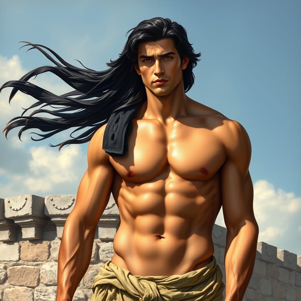 Prince Rus was extremely beautiful greek prince. He stands on top a fort, completely shirtless, ith body like a greek god. He was tall and well-built without seeming bulky, with shoulder length black hair. He had unrestrained air about him, with strong brows, seductive look and polished obsidian eyes, ...
