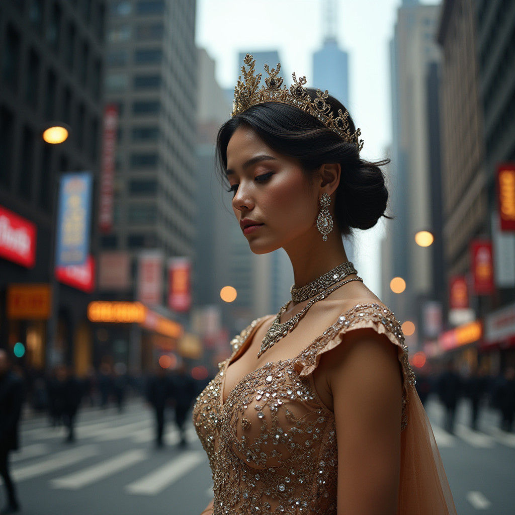 A hyperrealistic image shows a princess in Chicago. She wears opulent jewelry and a lavish gown. The city's architecture is in sharp focus. The cinematic image features HDR-enhanced colors.