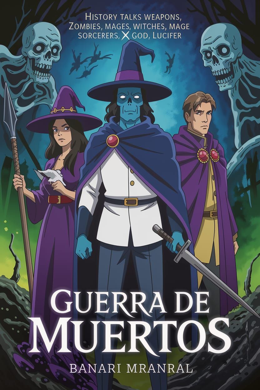This horror book cover features zombies, witches, and sorcerers, with elements of God and Lucifer. Includes the title "Guerra de Muertos" and three main characters.