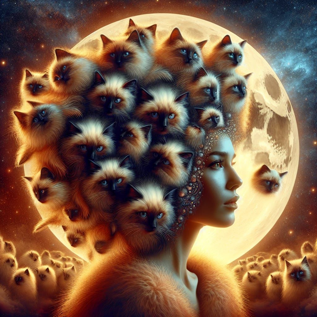 A surreal portrait of a woman whose hair is made of Siamese cats, set against a large moon. The image is richly detailed and uses warm colors, in a surreal digital art style.