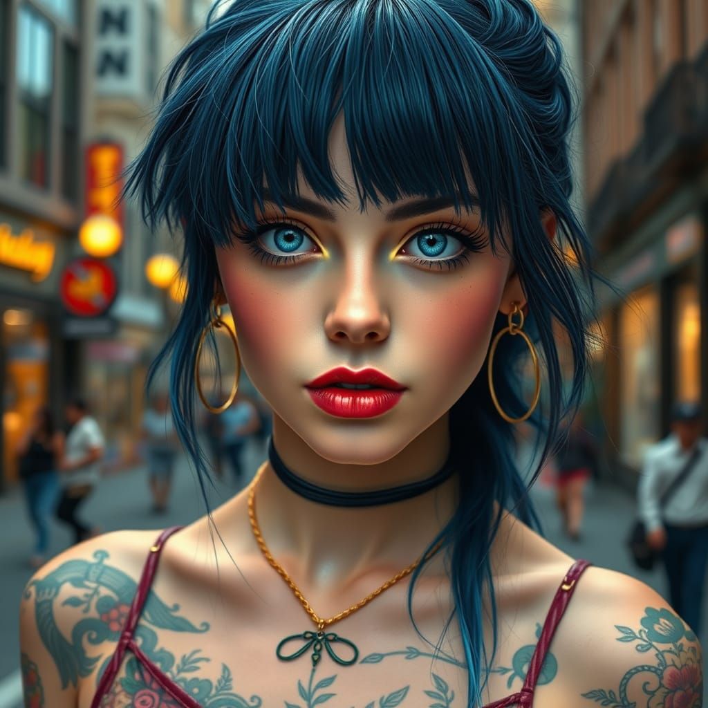 A captivating image of a young woman with pale skin and dark blue hair, set against a city backdrop, showcasing intricate details and textures reminiscent of hyperreal photography and digital painting techniques, with a touch of bohemian flair and modern sophistication.