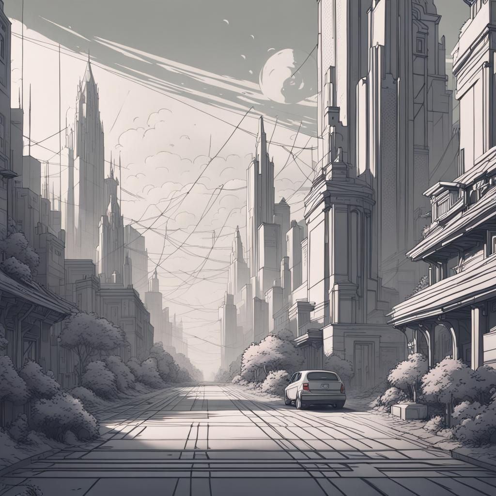 This image shows an artwork created using lines to define shapes and objects. A digital matte painting with intricate details, dramatic lighting, and a maximalist aesthetic.