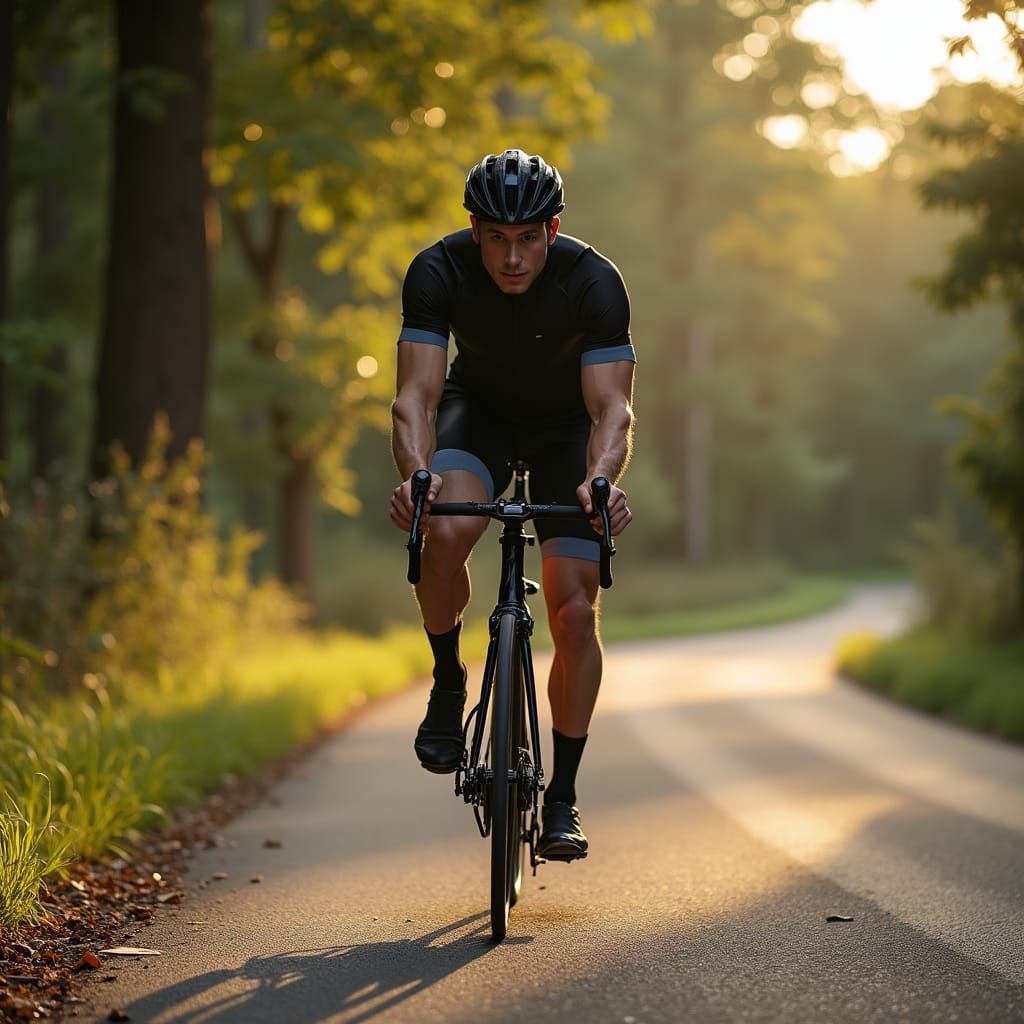 This image captures a man riding a bike through a lush, green landscape, surrounded by tall trees and bathed in the warm, golden light of late afternoon, with a focus on textures and the rider's physique.