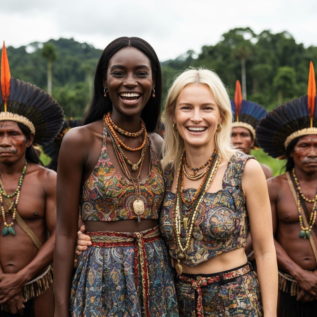 A photorealistic image showing two smiling women, one dark-skinned and one fair-skinned, in Alexander Wang outfits, standing with Brazilian tribe members protesting deforestation in the Amazon rainforest. Soft, natural lighting.