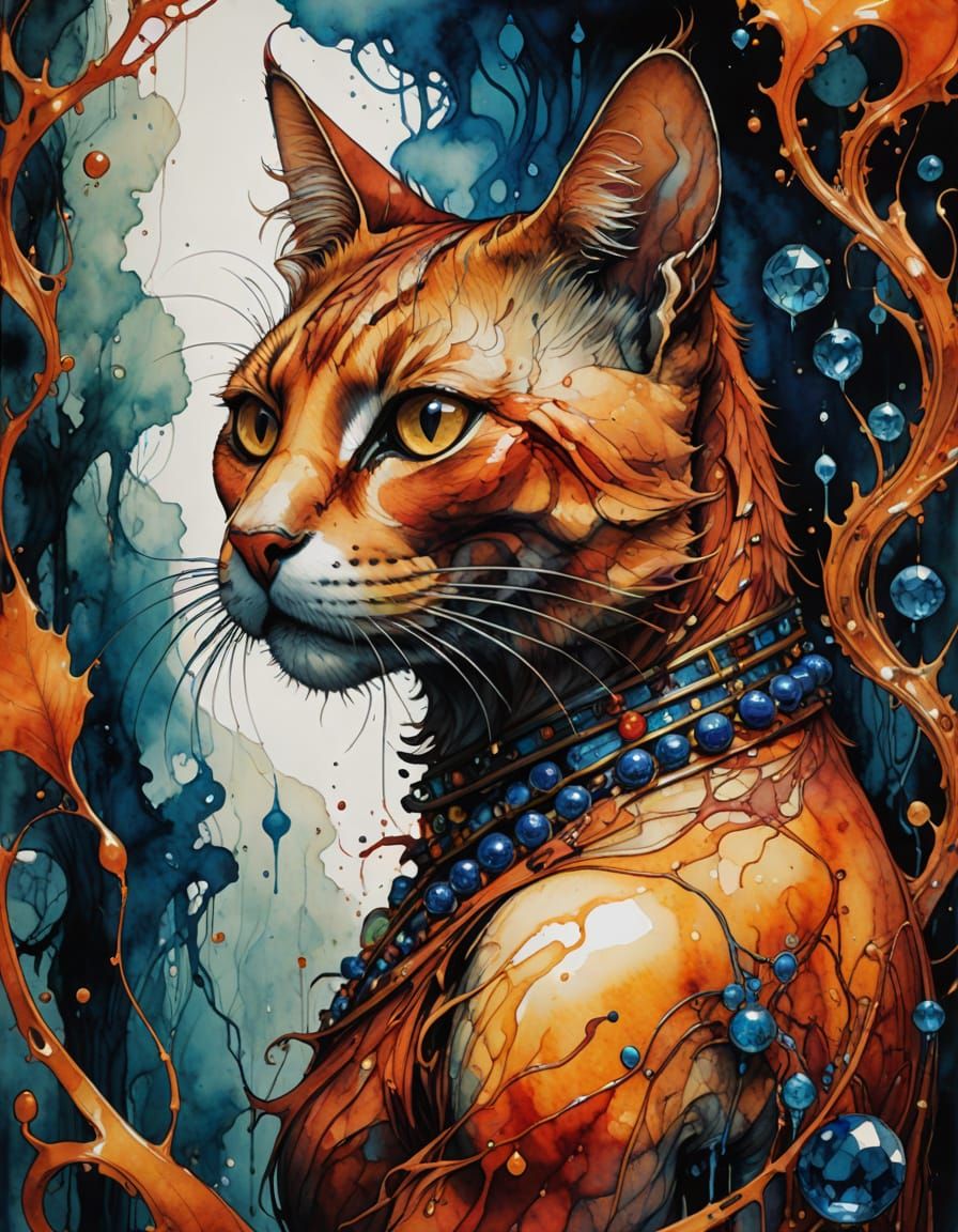 A surreal illustration of a cat with a long neck and tail, rendered in a neo-impressionist style with fluid ink lines and asymmetric patterns in orange, red, gold, and blue. The setting is a mystical forest.