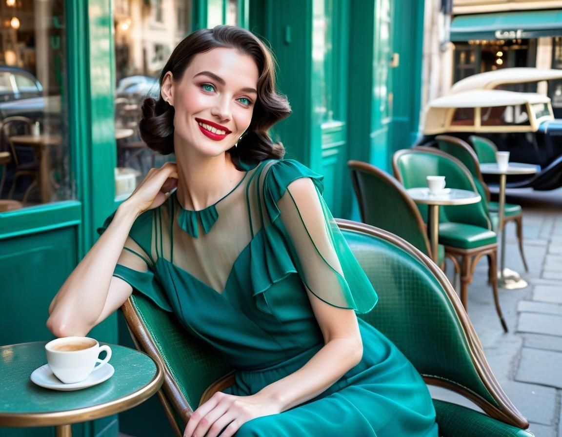 A captivating image showing a beautiful young woman in a green dress in 1930s Europe. The woman sits in a cafe, smiling, with a classic teal-blue racing car visible in the background.