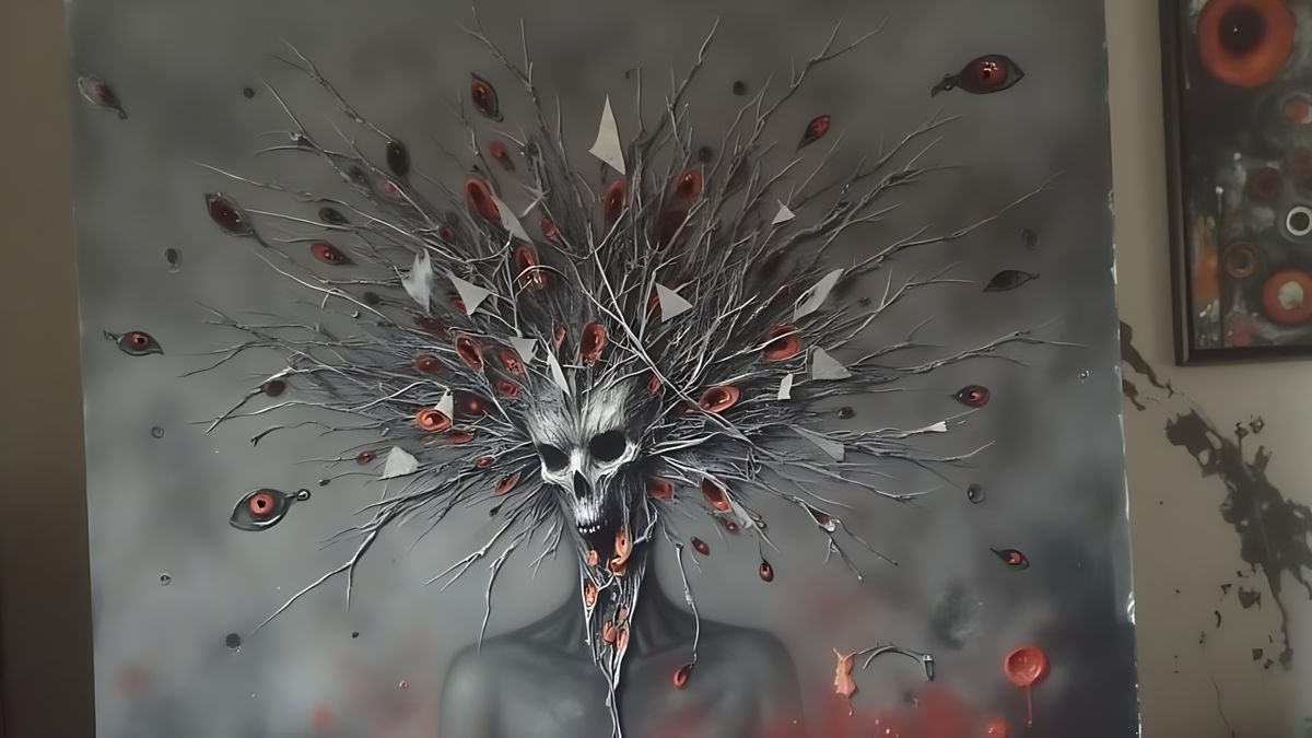 This image shows a dark digital painting of inner torment and psychological chaos. The scene is filled with haunting shadows and fragmented shapes, in a morbid aesthetic.