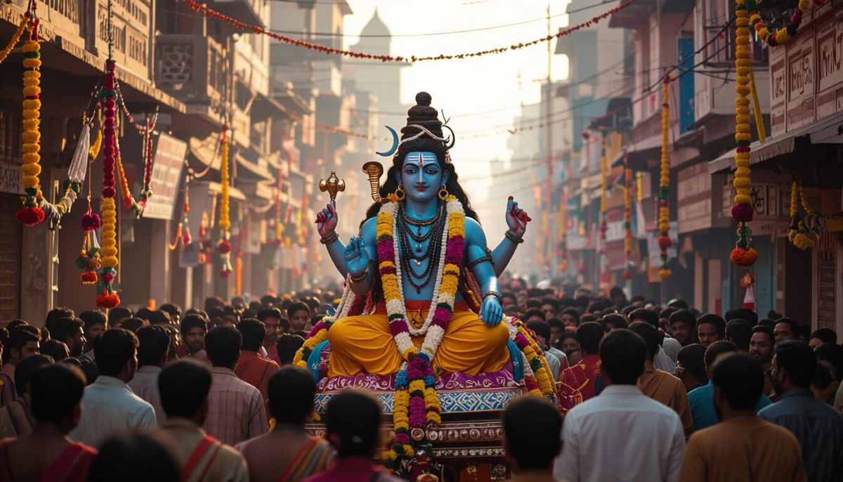 This image shows a vibrant Shivratri procession with a decorated Shiva idol carried on a chariot through village streets packed with devotees. Warm lighting and intricate details create a cinematic and festive atmosphere.