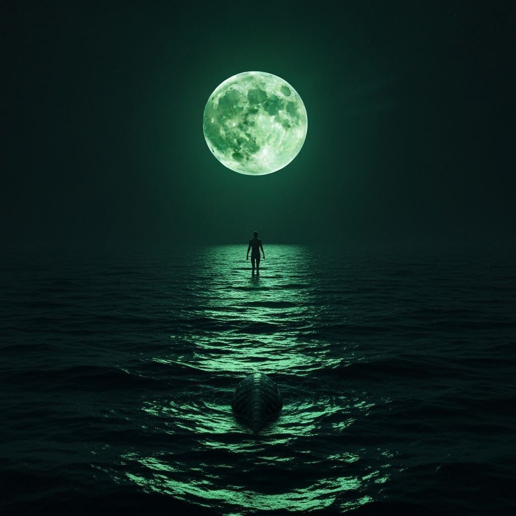 This image shows a mysterious aquatic humanoid figure in a dark sea under a green moon. The art has a surreal, cinematic aesthetic reminiscent of dark science fiction.