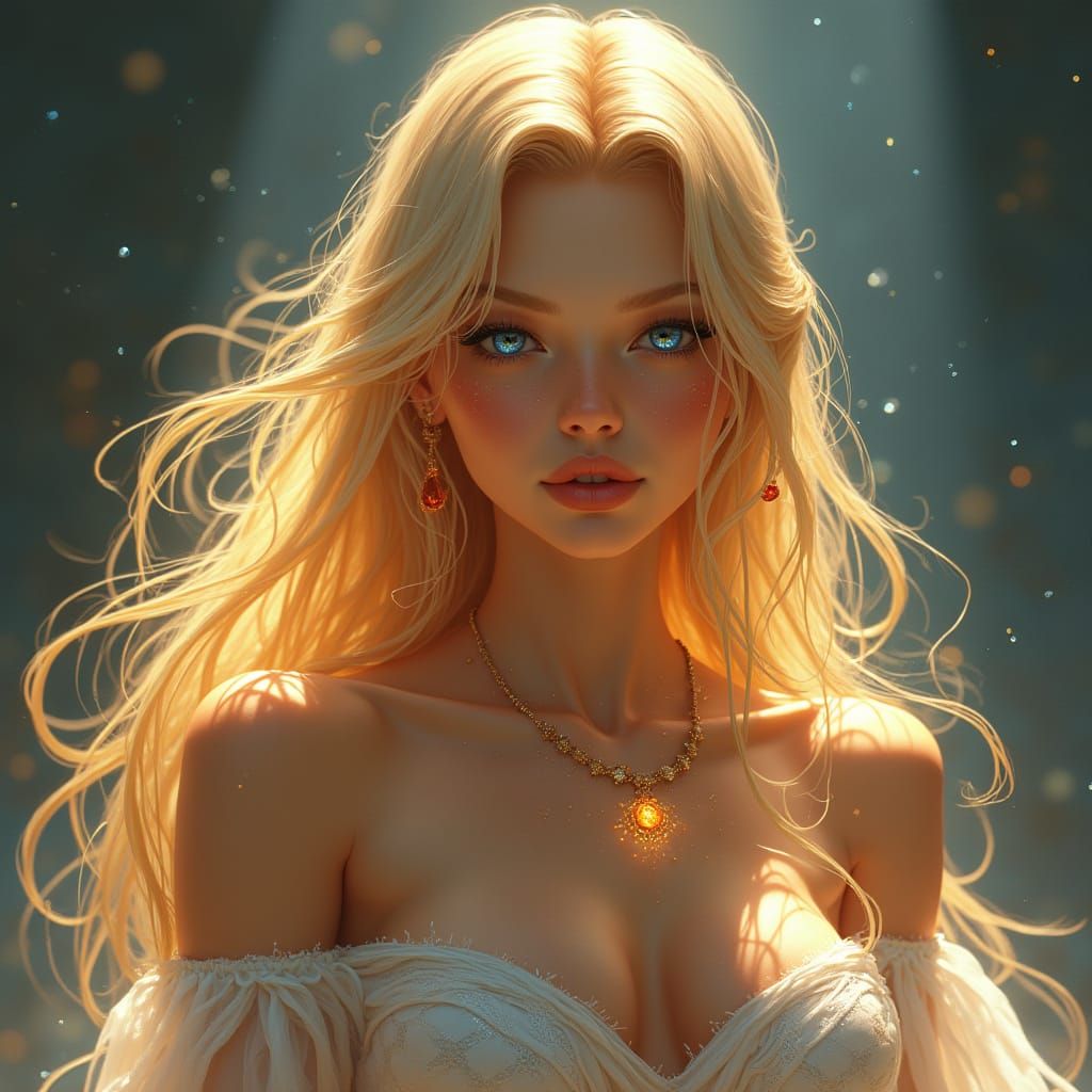 This mystical image depicts a fantasy female figure with flowing blonde hair, piercing blue eyes, and an ethereal glow, evoking a sense of otherworldly beauty and subtle power.