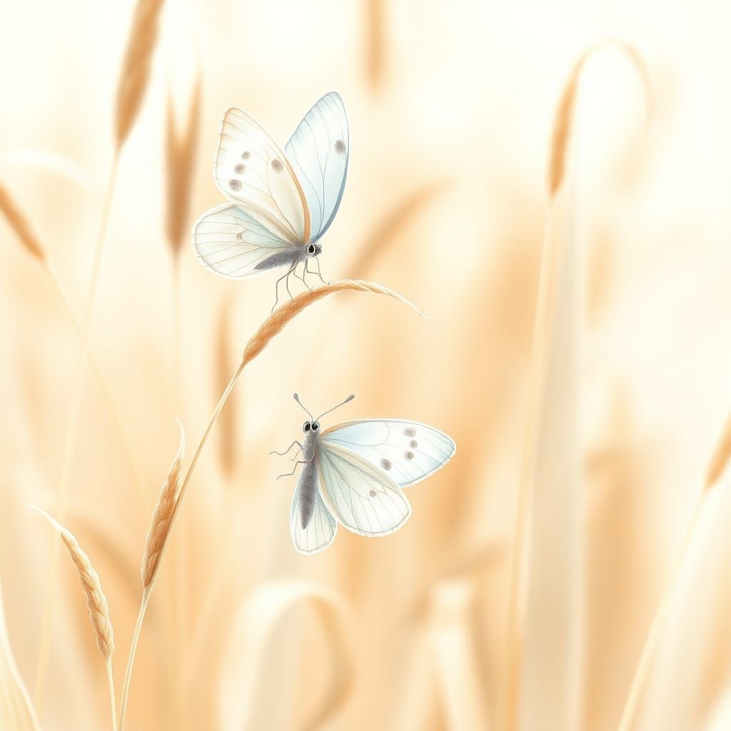 This image features two white butterflies perched on blades of grass, set against a soft focus background of beige-toned grasses. Rendered in dreamy watercolor hues, the scene evokes a sense of ethereal whimsy reminiscent of classic children's book illustrations.