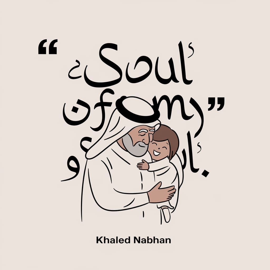 This image portrays an elderly Arab man warmly hugging his young granddaughter, emphasizing their emotional bond in a simple and elegant drawing. Soft lines and muted colors evoke a sense of intimacy and love, as the quote 'Soul of my soul' is subtly integrated into the design.