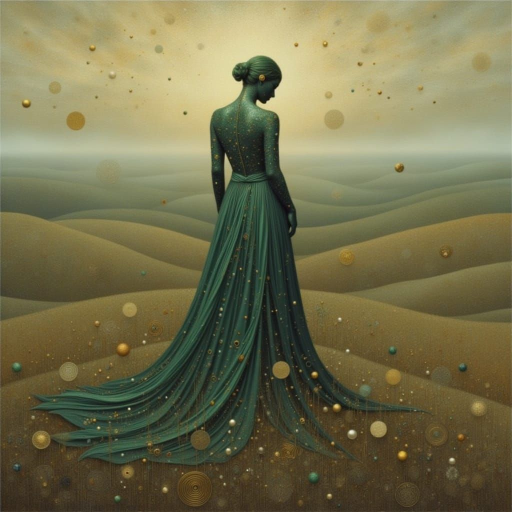 This image depicts a woman wearing a intricately designed dress inspired by earthy tones and filigree patterns, set against a surreal backdrop.