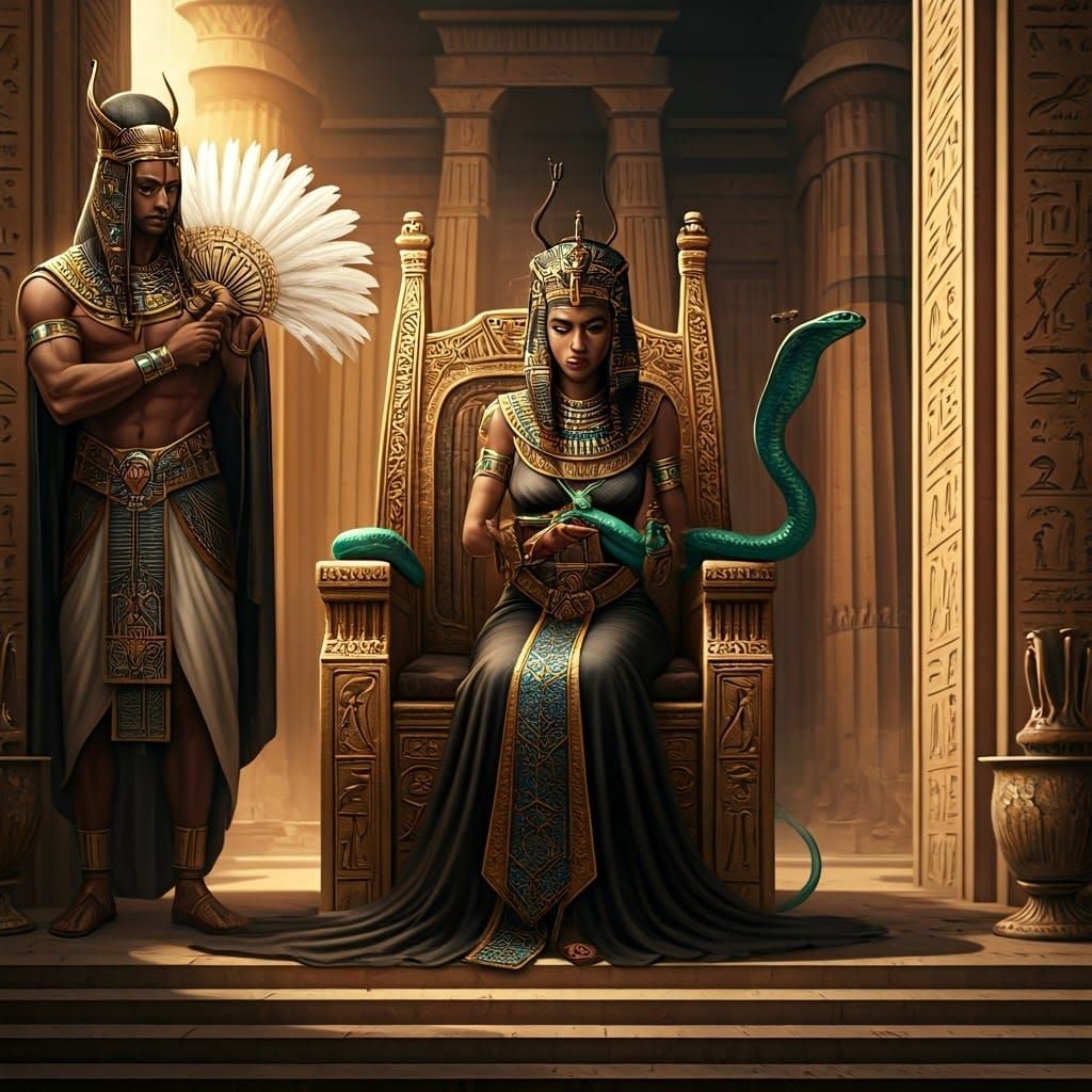 A stunning image of an Egyptian princess in ornate black and gold robes, sitting majestically on a golden throne, surrounded by the grandeur of a palace, with a muscular attendant holding a large white feather fan, in a vivid and atmospheric style