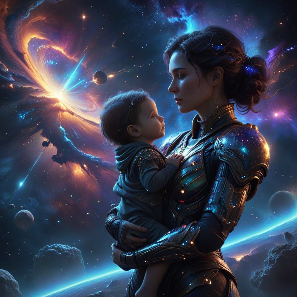 This image shows a mother holding her child amidst the vastness of space. Created in a detailed matte painting style with deep, complementary colors, it evokes a fantastical, intricate fantasy concept art aesthetic.