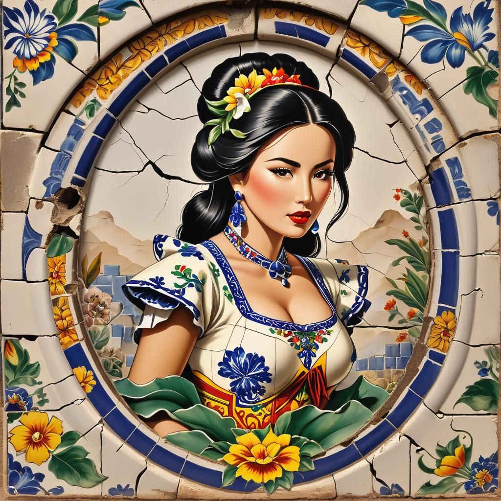 of a broken talavera tile wall with visible cracks. In the center, place a hole, a beautiful woman dressed as a china poblana. The scene sho...