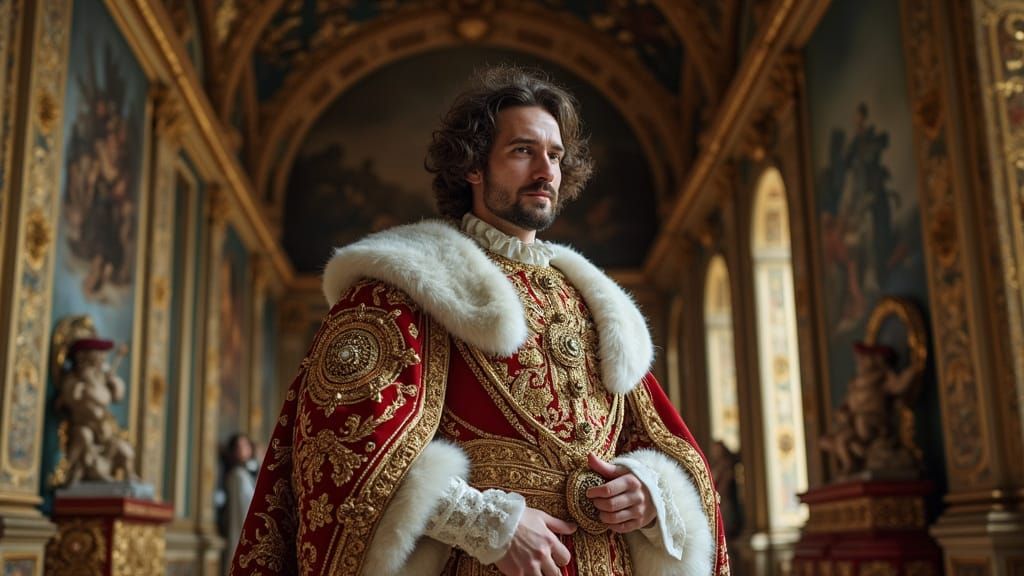 A portrait of Louis XIV in royal clothing, standing in a Versailles hall. The image showcases Baroque details and draws inspiration from 18th-century portraiture.