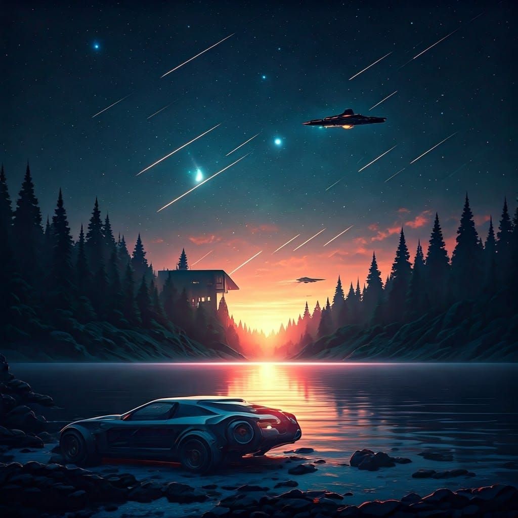 This image shows a girl sitting on a hill, surrounded by a vibrant, neon-lit night sky filled with spaceships and shooting stars. The scene blends traditional and digital media in a futuristic, otherworldly aesthetic.