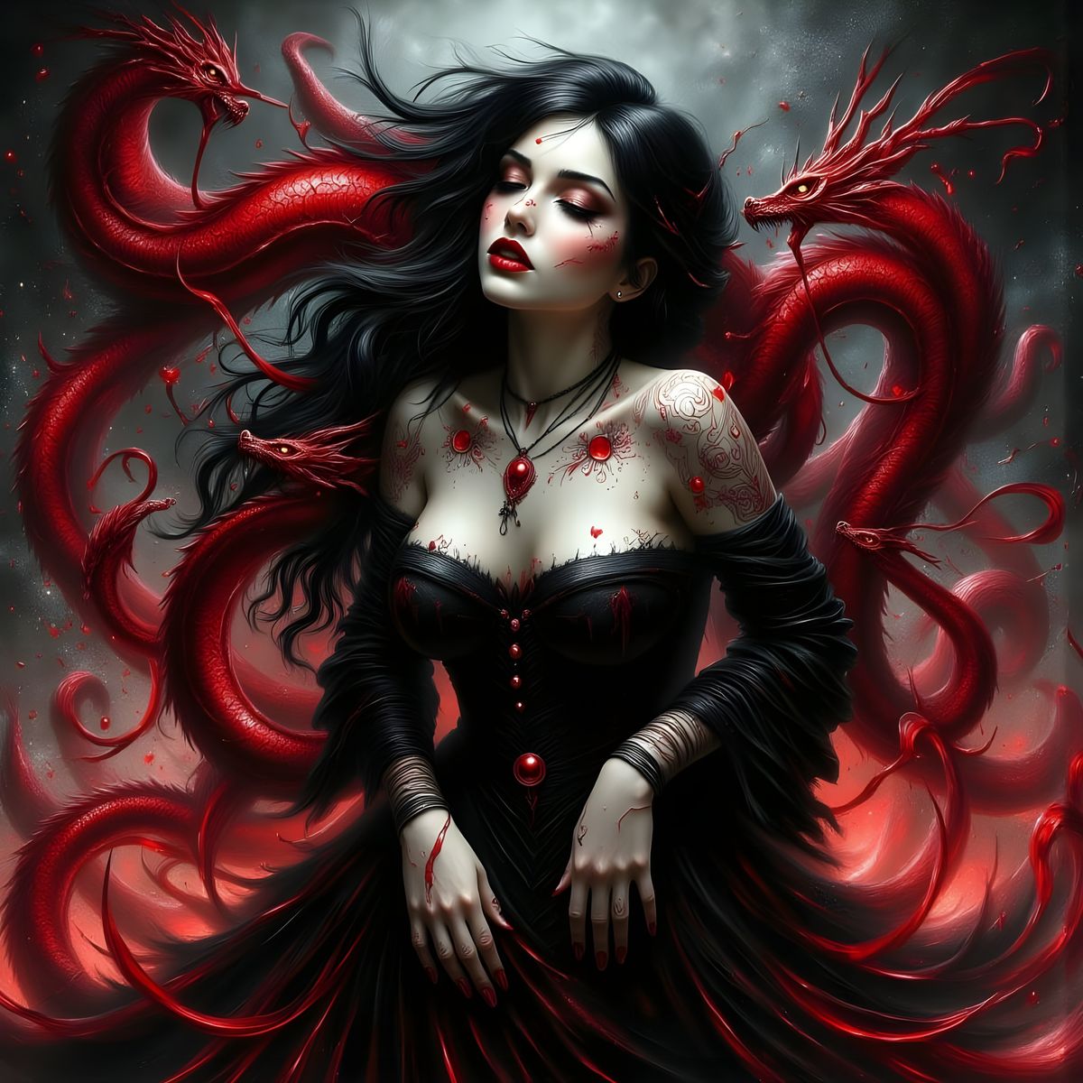 This image shows a sorceress with red dragon tattoos standing in the shadows. The painting features elegant curves, voluminous black hair with red strands, and flowing black silk robes in a dark fantasy style.