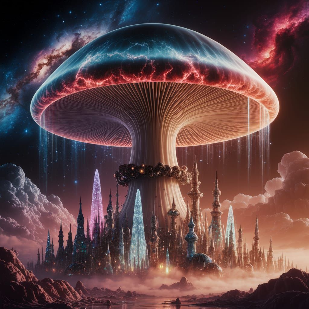 A colossal cosmic mushroom towers in a surreal, star-filled universe, its massive cap stretching wide like an alien mesa and supporting a stunning, luminous steampunk cityscape with glittering towers, crystal spires, floating bridges, and cascading lights. The semi-transparent stem glows with interstellar energy, streaked with nebula-like tendrils, while the background features swirling galaxies and vivid nebula clouds in deep blues, purples, and crimson hues. The city glows with bioluminescent hues and soft radiant mist, bathed in warm, hyperdetailed lighting and cosmic surrealism, evoking the aesthetics of Moebius and Simon Stålenhag.