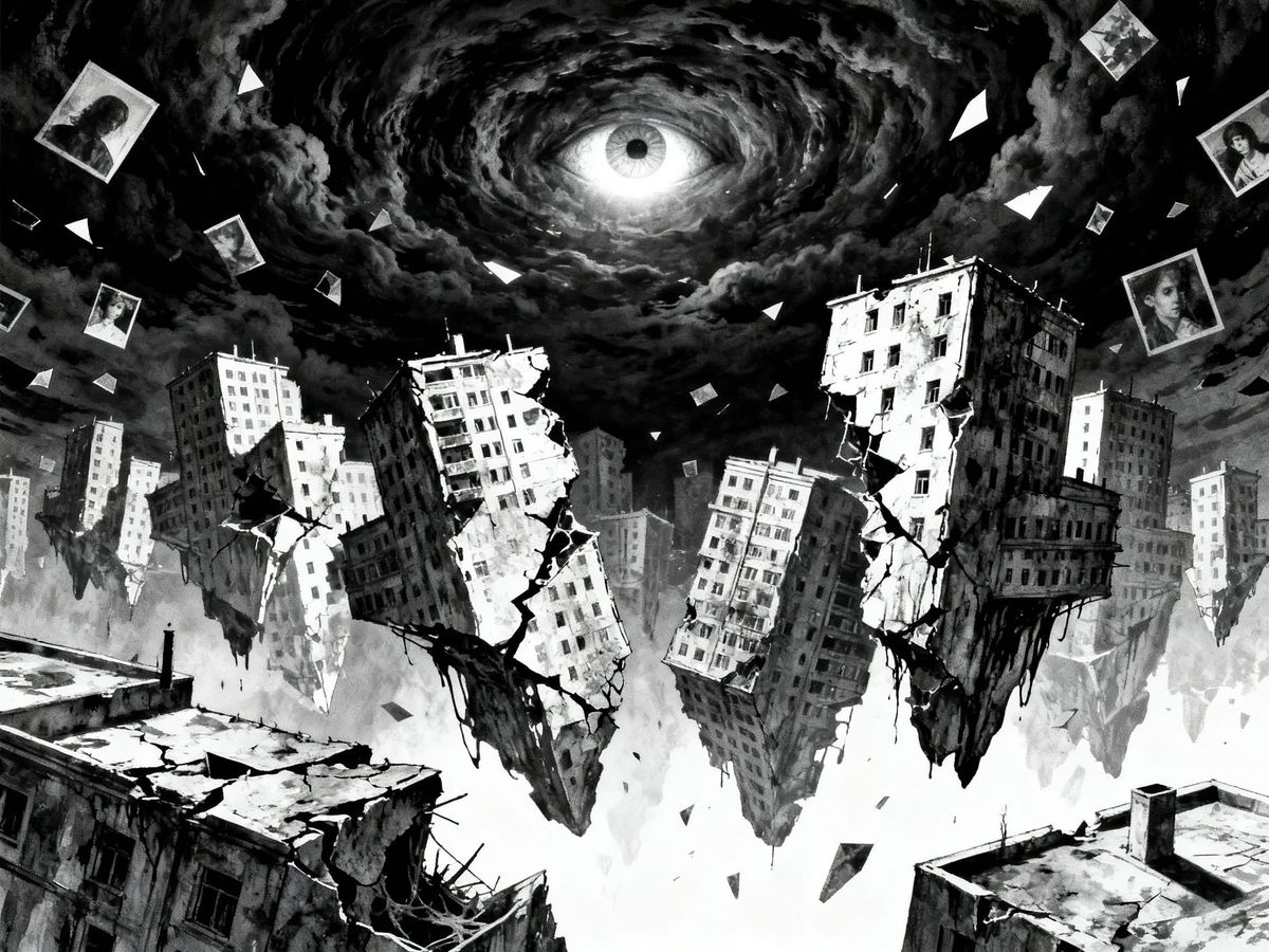 This image depicts a surreal, fractured cityscape of impossible buildings suspended in a void. A single eye watches from a monochromatic sky, evoking psychological horror and subconscious fear.