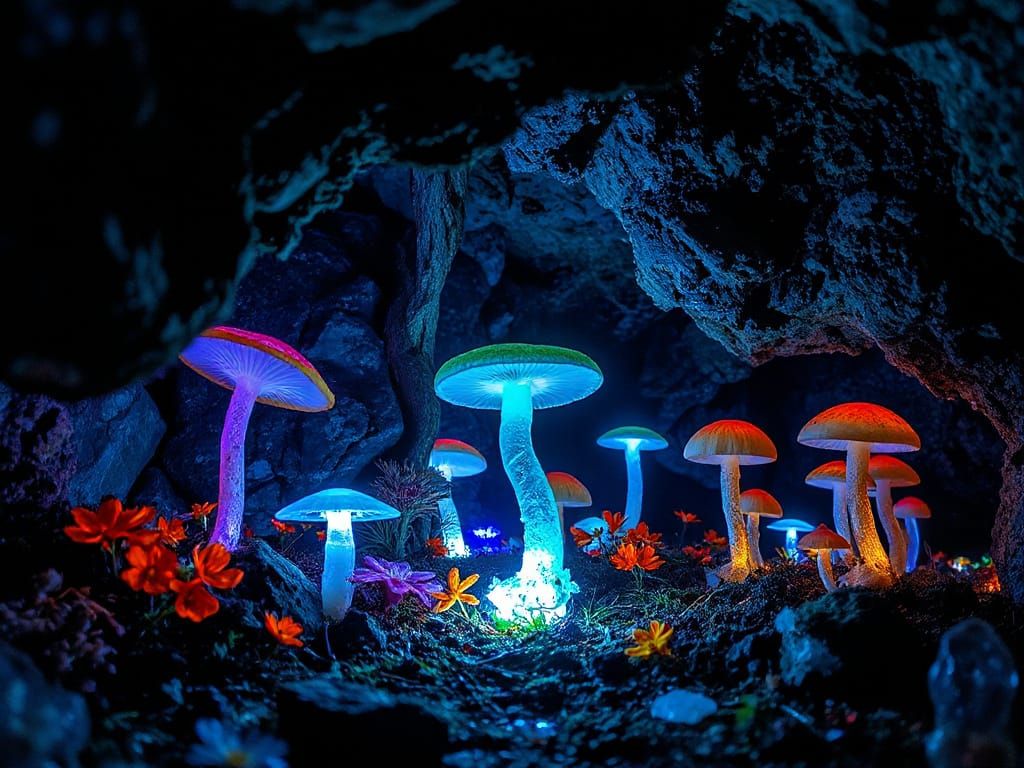 Easily generate stunning images of glowing mushrooms and flowers in caves with our free AI image generator, perfect for fantasy and sci-fi art