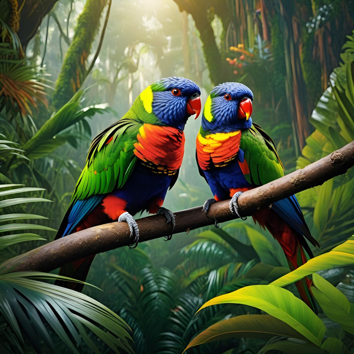 analog photo, two Rainbow Lorikeets , Australian rainforest background detailed matte painting deep color storybook illustration 8k resoluti...