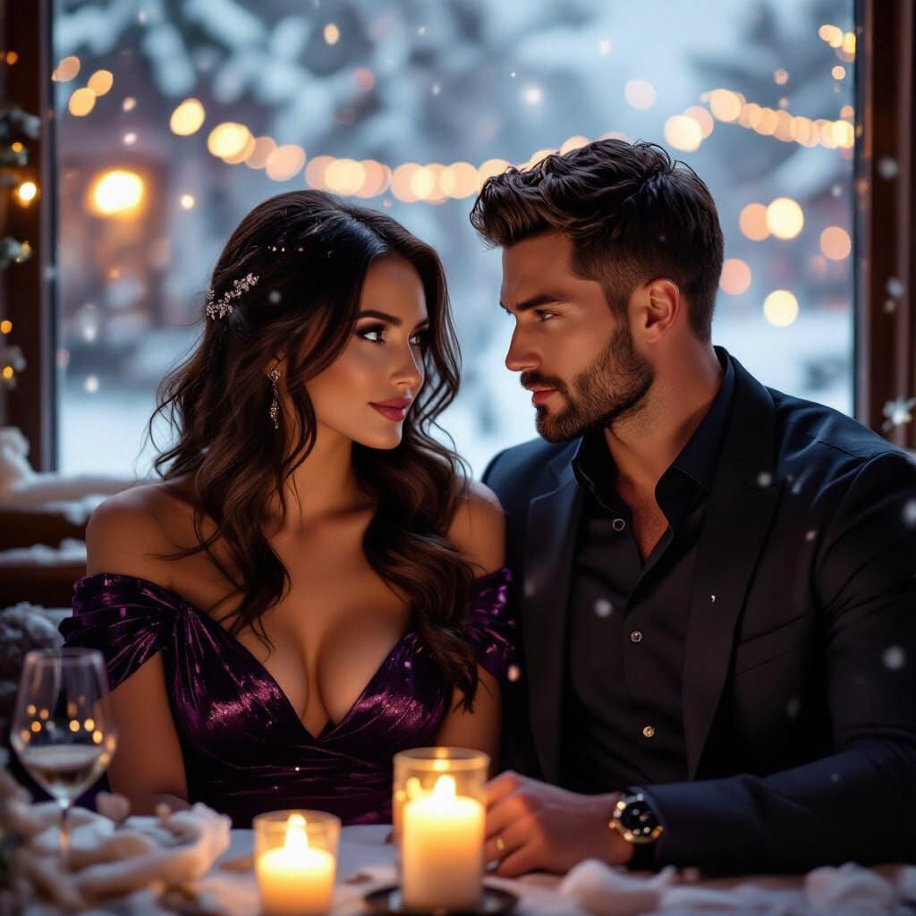 This image captures a young couple sharing an intimate moment by candlelight, set against a cold winter night. Rendered in a style evoking rich, dramatic lighting and expressive brushstrokes.