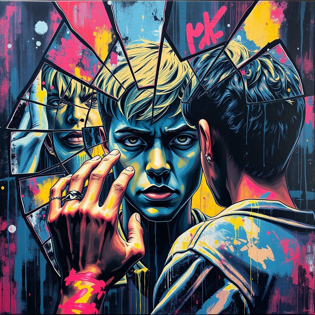 This dynamic graffiti art shows a person's fragmented reflection in cracked mirrors, conveying inner turmoil. Rendered with splash art and spray paint textures, it features high contrast and vivid colors.