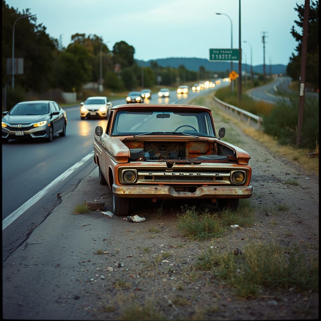 This image shows a hyperrealistic vintage pickup truck abandoned on the roadside. Modern high-end cars pass by. The image has a cinematic film still aesthetic with film grain and dramatic lighting.