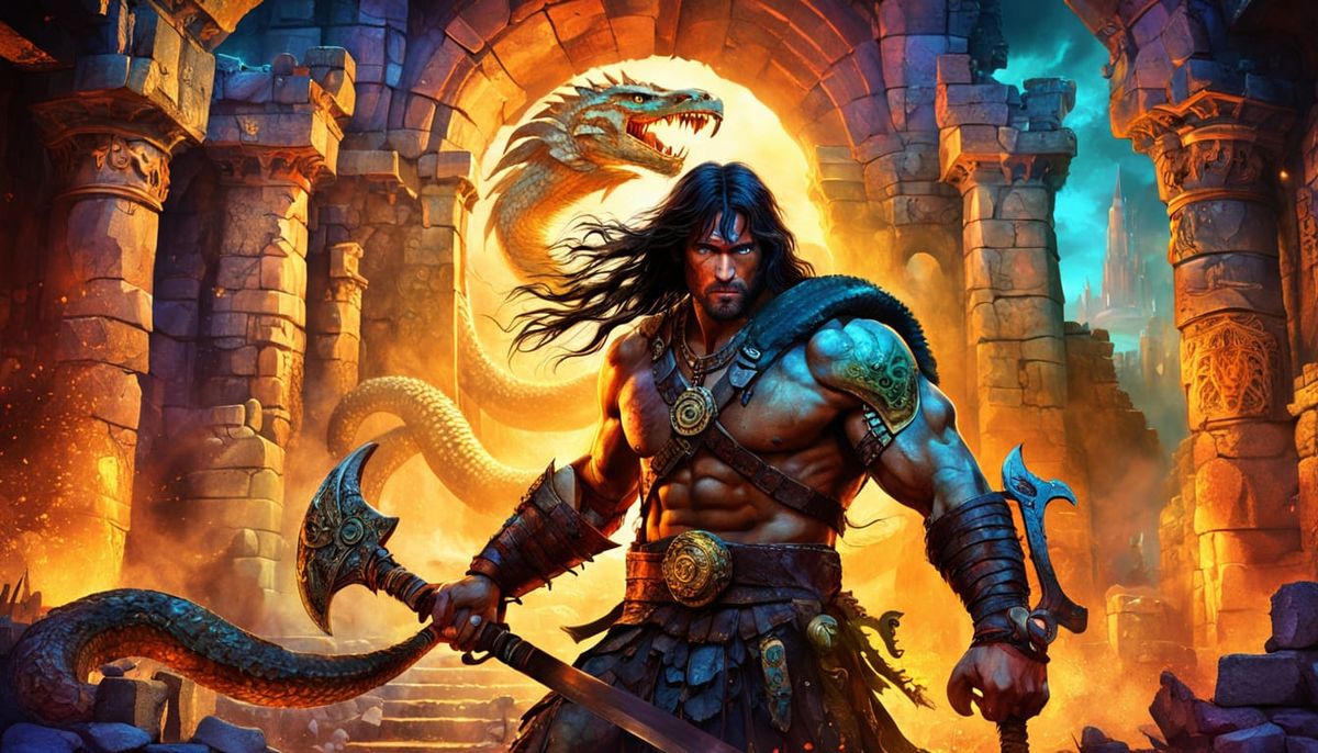 A vibrant image showing Conan the Barbarian in a fierce battle with a venomous serpent. The scene is set among ancient ruins, enhanced by golden lighting and a misty atmosphere in the style of splash screen art.