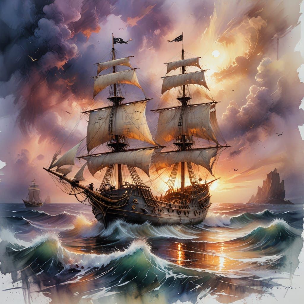 A vibrant oil painting of a pirate ship battling a stormy sea at twilight. The artwork captures a blend of chaos and beauty with impasto waves and dramatic lighting, rendered in a watercolour style.