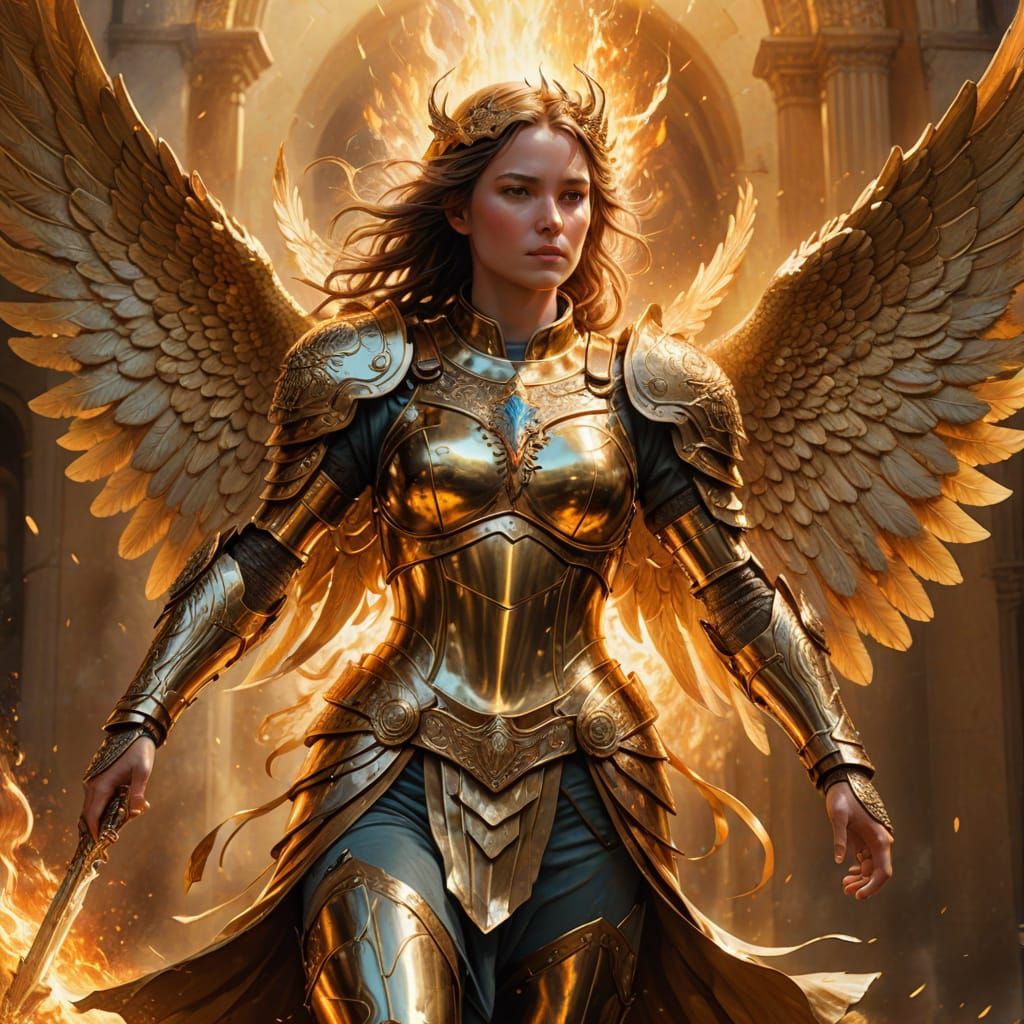 Transform your imagination into stunning visuals with our free AI image generator. Easily create angelic scenes with holy fire and bronze armor.