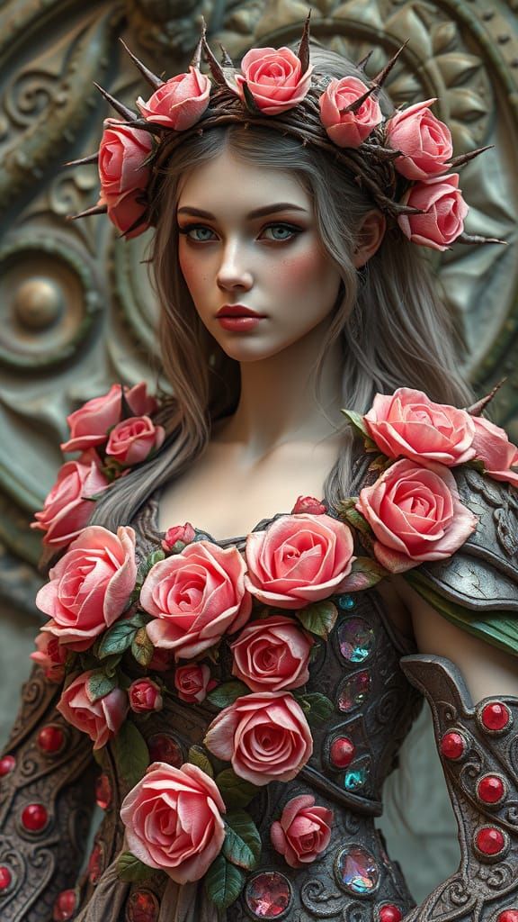 A striking picture of a female druid priestess in rose-themed armor. The image features hyperdetailed carvings, floating crystals, jewel-tone colors, iridescence, and magical particles in a photorealistic style.