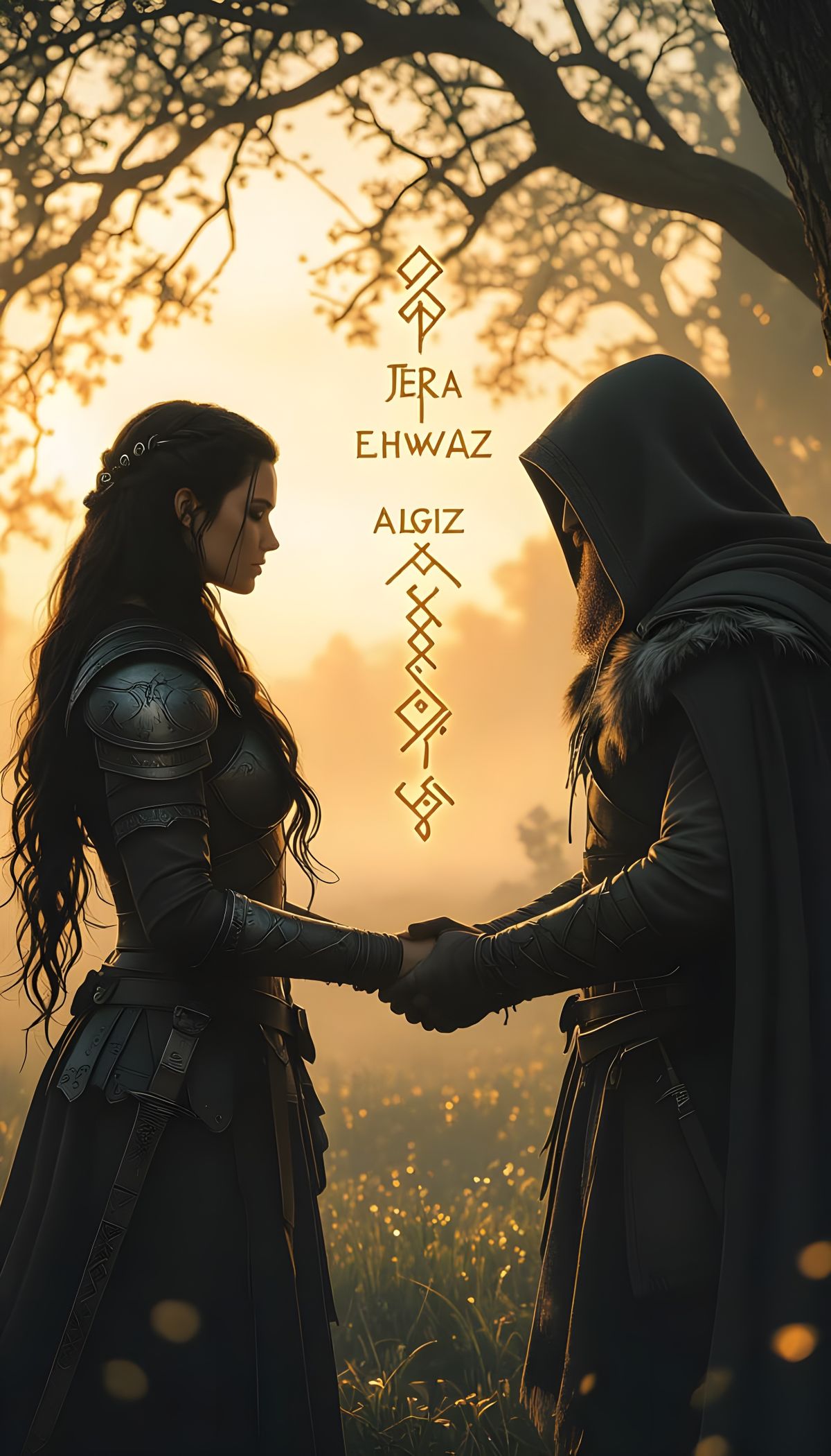 At the edge of a sacred Nordic grove, two figures approach each other — a shieldmaiden with dark flowing hair and a warrior cloaked in twilight hues. Their hands almost meet, glowing faintly with golden light, as if the runes themselves have blessed this moment. Around them, Jera, Ehwaz, and Algiz shimmer softly in the air, while the morning sun filters through the trees, painting the scene with warmth. The atmosphere is tender, fateful, and deeply spiritual — a moment of reunion beyond time.